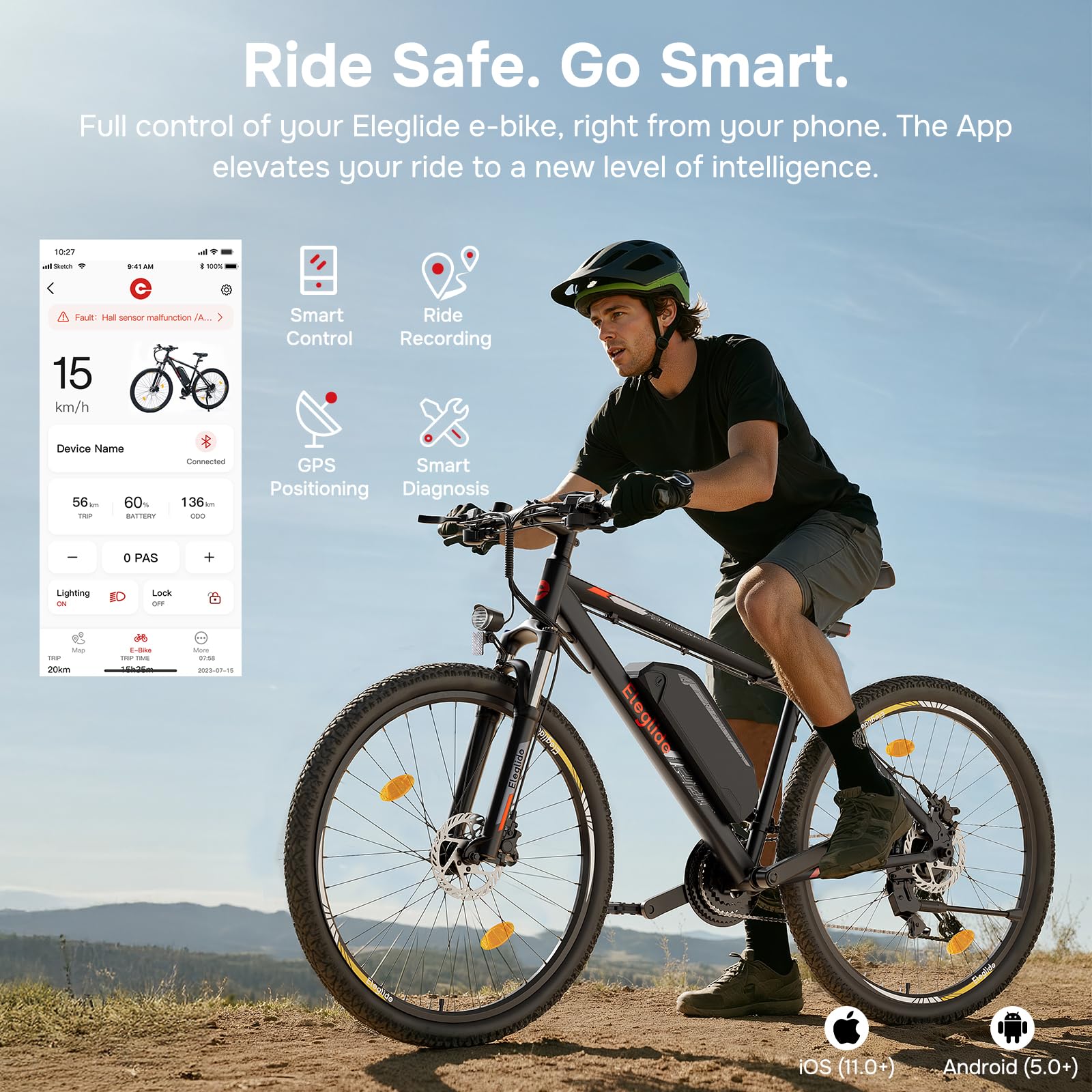- ใ๐๐ฆ๐๐ซ๐ญ ๐๐๐ & ๐๐ฉ๐ฉ ๐๐จ๐ง๐ญ๐ซ๐จ๐ฅใEleglide M2 electric bike for adults comes with an intelligent LCD display that keeps you informed of all the important details, like the real-time speed, trip distance and remaining battery power. You can switch ๐๐ฌ๐ฌ๐ข๐ฌ๐ญ ๐ฅ๐๐ฏ๐๐ฅ๐ฌ, ๐ฌ๐๐ญ ๐ฌ๐๐ซ๐๐๐ง ๐ญ๐ข๐ฆ๐๐จ๐ฎ๐ญ, ๐๐๐ญ๐ข๐ฏ๐๐ญ๐ ๐ฐ๐๐ฅ๐ค ๐ฆ๐จ๐๐ ๐๐ง๐ ๐ฆ๐จ๐ซ๐ ๐ซ๐ข๐ ๐ก๐ญ from the display. Furthermore, you can control your bike via the ๐๐ฅ๐๐ ๐ฅ๐ข๐๐ ๐๐๐ on your phone. The intelligent app allows you to activate additional functions, such as locking the bike, setting a password and adjusting the screen timeout, getting more out of your ride.