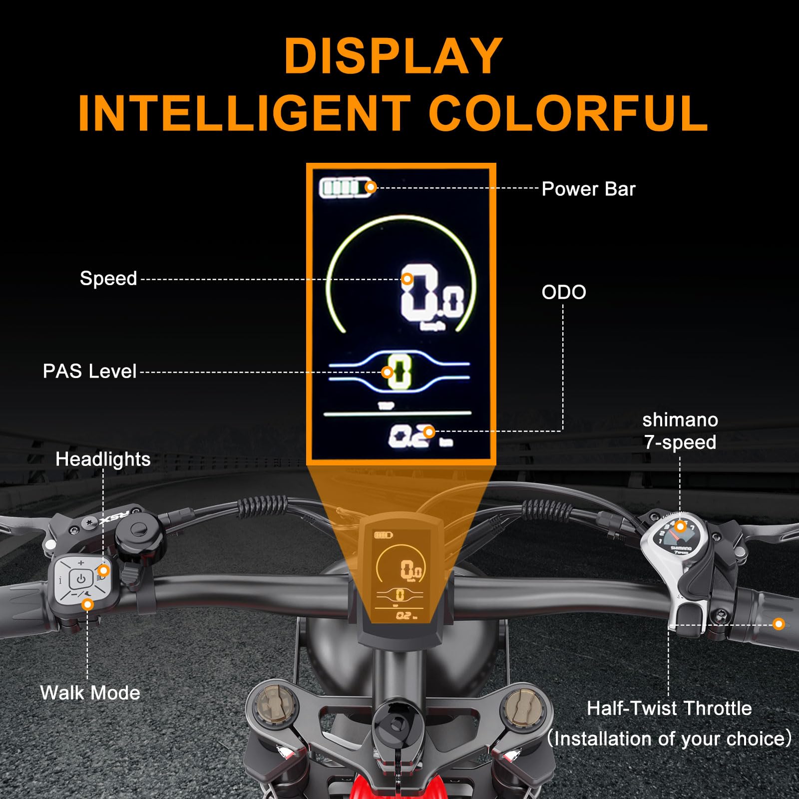 - ๐๐๐ ๐๐ข๐ฌ๐ฉ๐ฅ๐๐ฒ - In this bicycle electric,you can easily keep track of the driving speed and mileage, as well as the remaining battery power at all times so you can avoid running out of power. The gear up/down buttons are used to set the gears, and the horn and light button on the handle provide further protection.