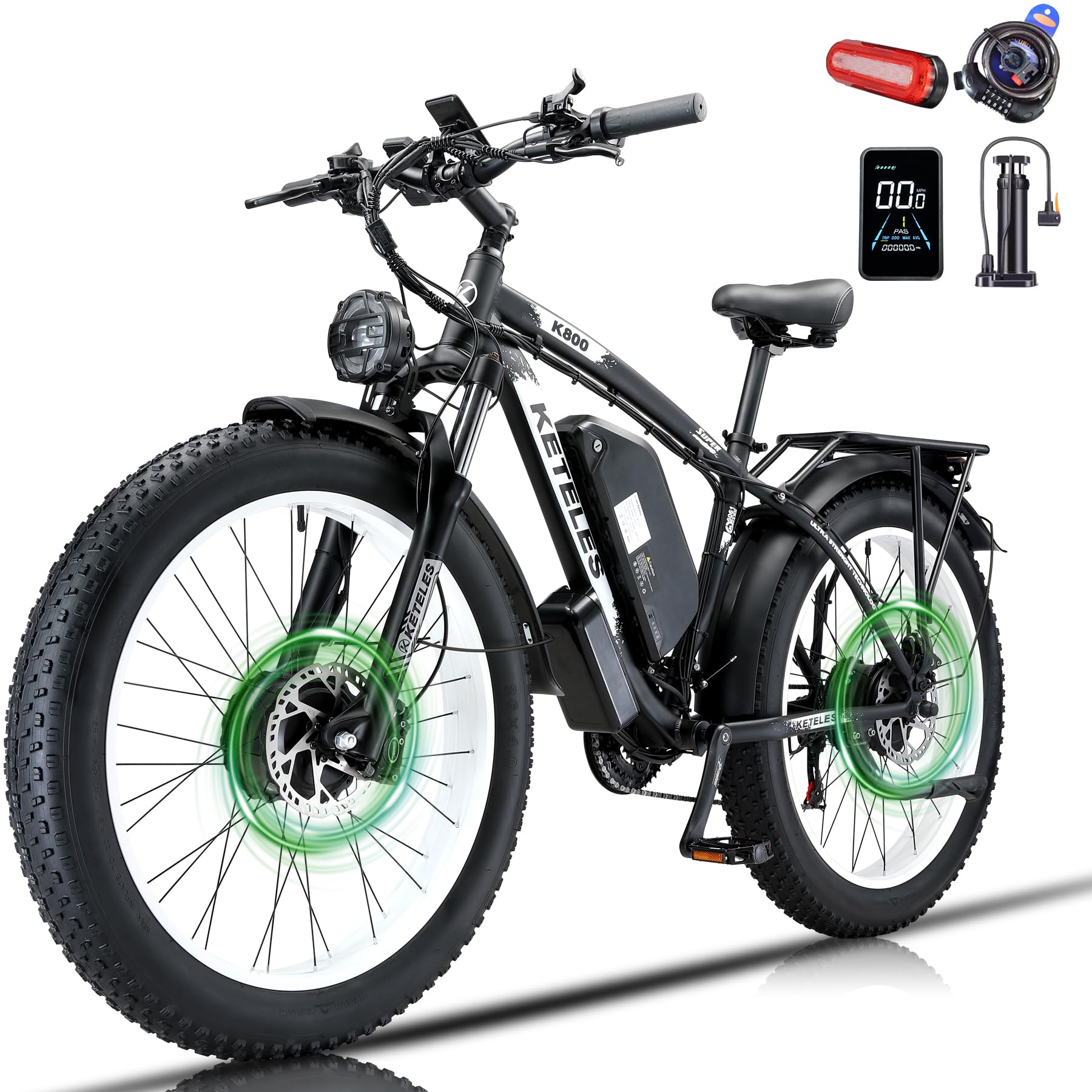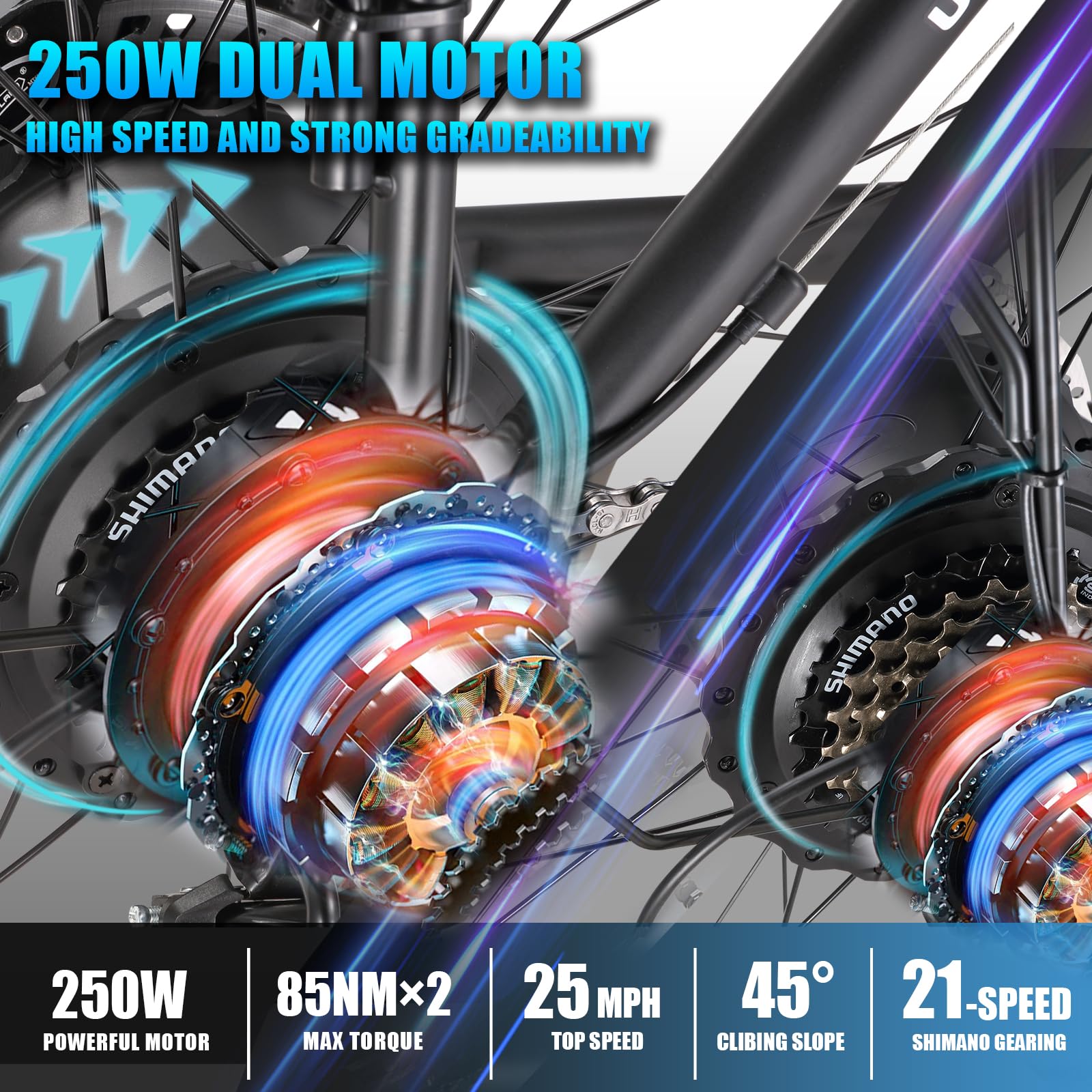 - 1.Dual Motor Electric Bike.26" Fat Tyres with 4.0" Diamond Tread. Smooth pedal-assist up to 15.5mph,UK-Optimised All-Weather Traction Engineered for British mud, wet cobblestones & coastal paths. Puncture-resistant tyres provide 30% stronger grip vs standard MTBs (tested on 25° Lake District slopes). Ideal for Yorkshire Dales adventures or rainy city commutes.