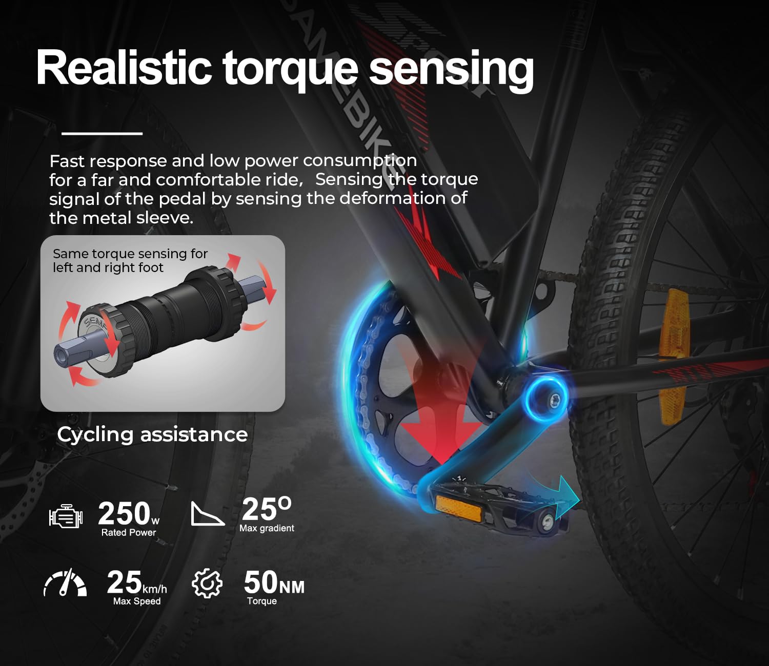 - 【5 Adjustable PAS Levels & Torque Sensor】Equipped with a powerful motor that delivers 50 Nm of output and torque sensor, SAMEBIKE mountain bike reacts to the rider's pedal effort, producing faster movements with greater force. climbing is easier smoother and more efficient.The 7-speed flywheel combined with 5 adjustable PAS levels provides comfortable riding.