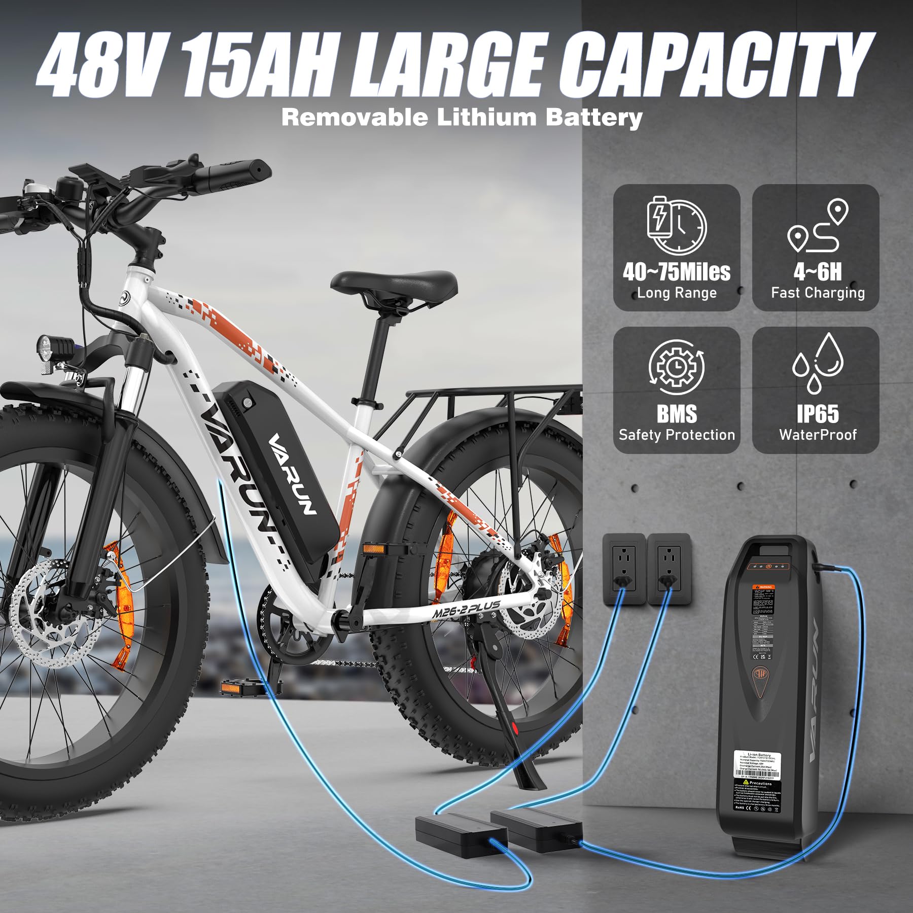 - ๐๐๐ ๐๐๐ ๐๐ก ๐๐๐ญ๐ญ๐๐ซ๐ฒ ๐๐จ๐ซ ๐๐๐๐๐ ๐๐๐ง๐ ๐: Power your extended journeys with the Varun electric bike, equipped with a ๐๐๐ ๐๐๐๐ก (720 Wh) battery that delivers up to ๐๐๐๐๐ (๐๐๐๐ข๐ฅ๐๐ฌ๏ผof range. ๐๐๐ Protection, ๐๐๐๐ ๐ฐ๐๐ญ๐๐ซ๐ฉ๐ซ๐จ๐จ๐ design and key-locked anti-theft features all provide effective protection for the battery, removable battery design offers convenient charging at home or in the office, eliminating range anxiety and making this electric bike for adults an ideal choice for long commutes and weekend adventures